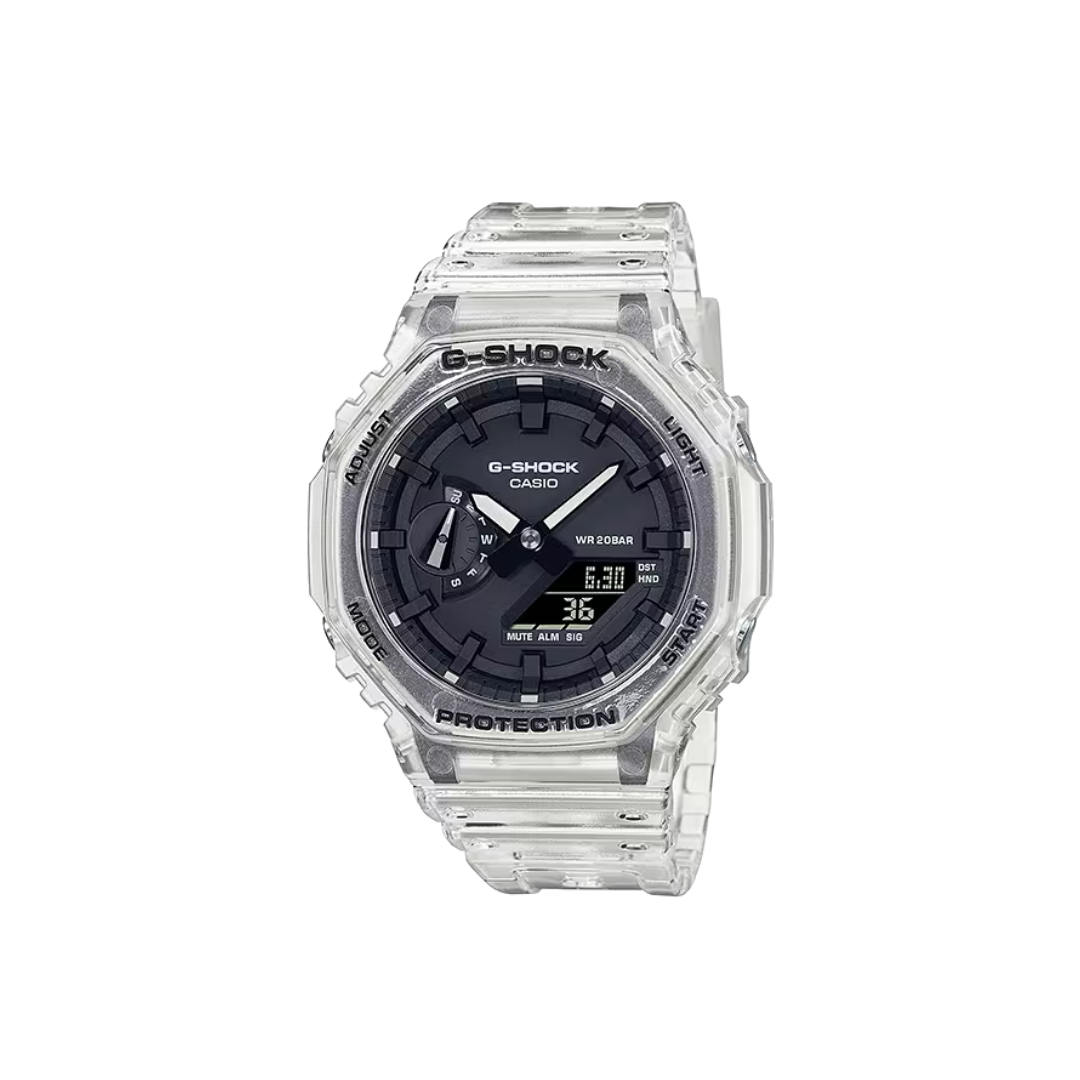 De CASIO G-SHOCK GA-2100SKE-7AER is een gedurfd en modern horloge dat opvalt door zijn transparante ontwerp. Deze “CasiOak” uit de Skeleton-serie combineert de iconische achthoekige vorm van de GA-2100 met een semi-transparante behuizing en band, wat zorgt voor een futuristische en stijlvolle uitstraling.