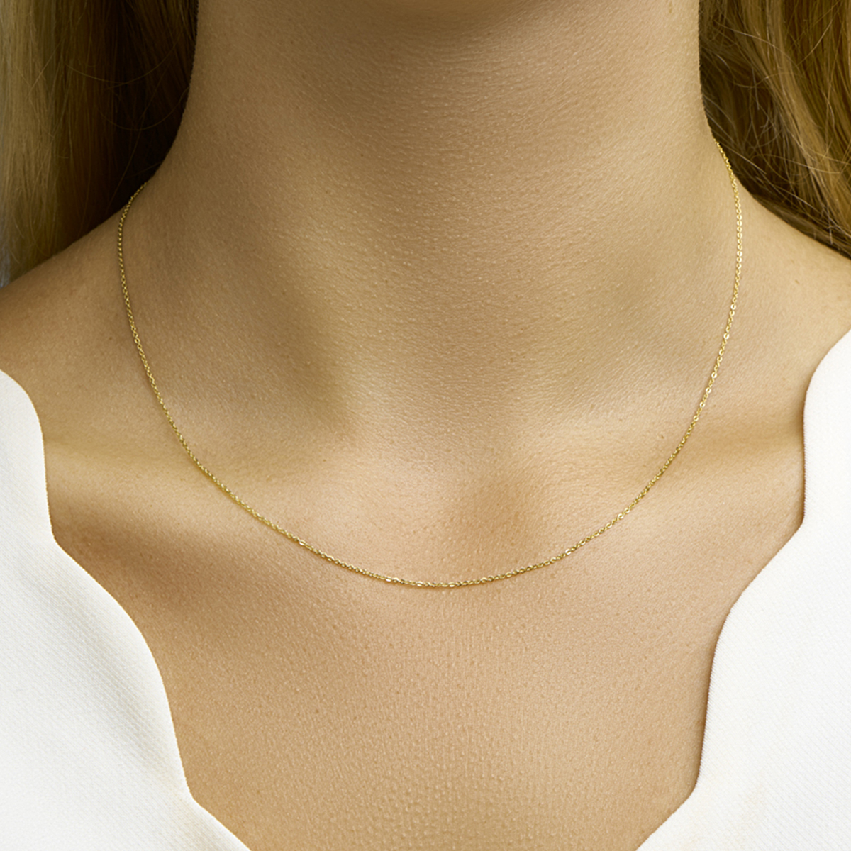 Een fijn gouden anker collier van 1mm breed. De anker schakel glanst erg mooi en is mooi zonder of met hanger te dragen.