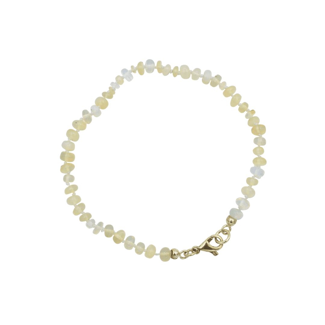De armband is geknoopt, wat inhoudt dat er tussen elke opaal een knoopje zit. Zo blijven de opalen beter beschermd omdat ze niet tegen elkaar krassen.