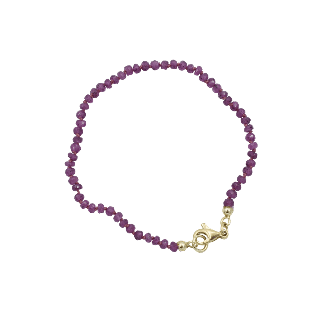 Voeg een vleugje luxe toe aan je sieradencollectie met dit geknoopte armbandje met robijn. De zorgvuldig geslepen robijnsteentjes van ca. 3 mm zijn met de hand geknoopt en stralen diepe, warme tinten rood uit. Het armbandje is afgewerkt met een verfijnd 14k (585) geelgouden slotje, wat zorgt voor een stijlvolle en duurzame afwerking.