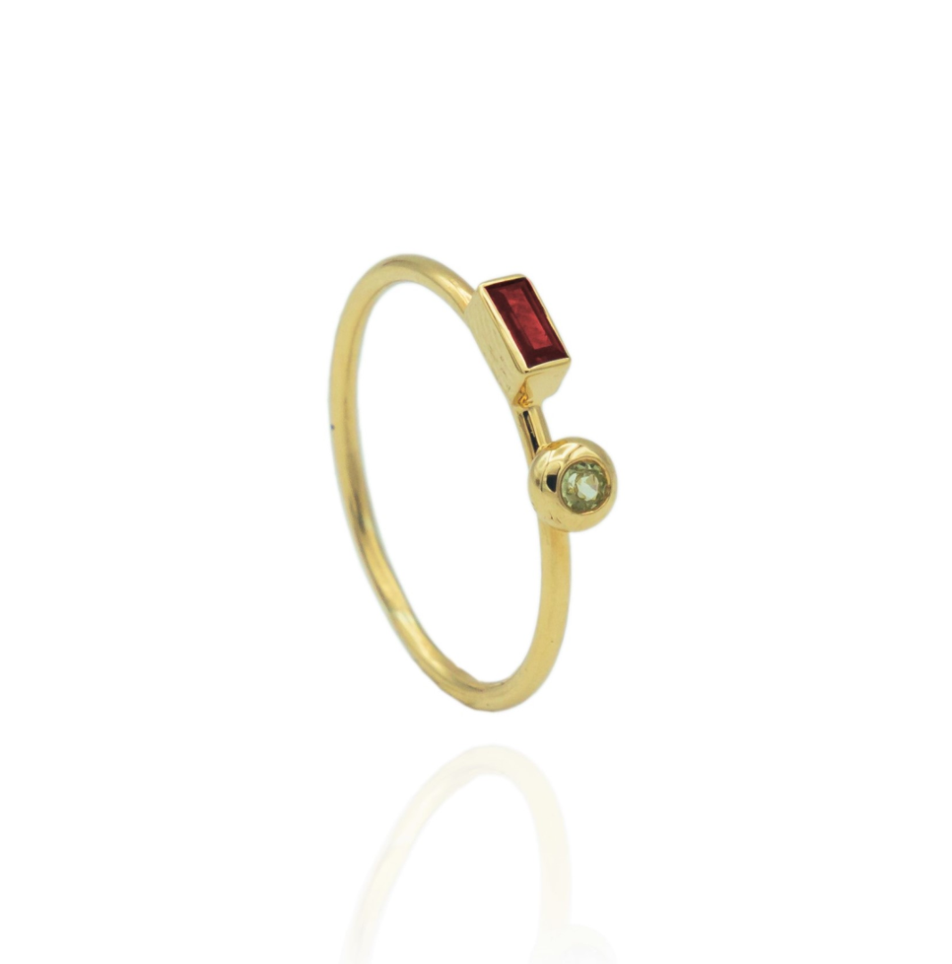Gouden aanschuifring met robijn en peridoot