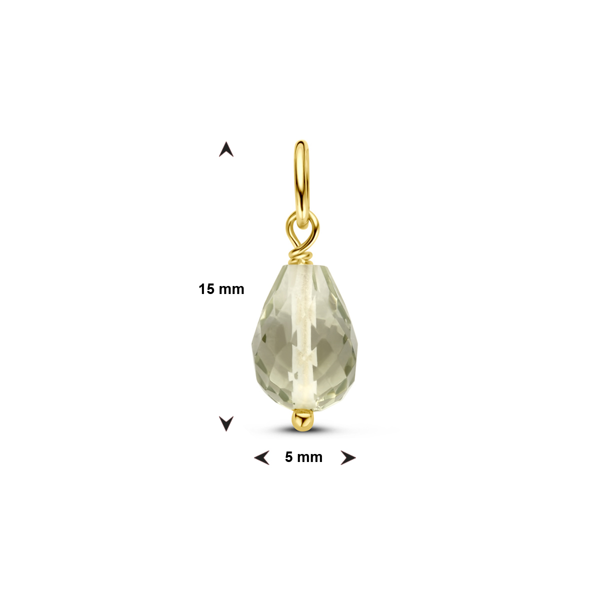 Dit gouden hangertje met groene amethist heeft een verfijnde, frisse uitstraling. De briolet geslepen edelsteen fonkelt prachtig dankzij de fijne facetten en haar zachte groene kleur. De hanger is zowel elegant aan een fijne ketting als stijlvol aan een creool te dragen, waardoor hij moeiteloos met elke look combineert. Een tijdloos sieraad met een subtiele, luxueuze glans.