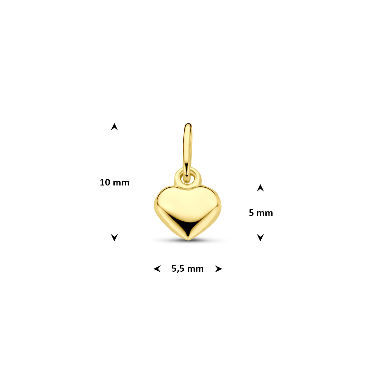Geelgouden harthanger met een totale lengte van 10mm. Het hartje is 5,5mm breed en 5mm hoog.