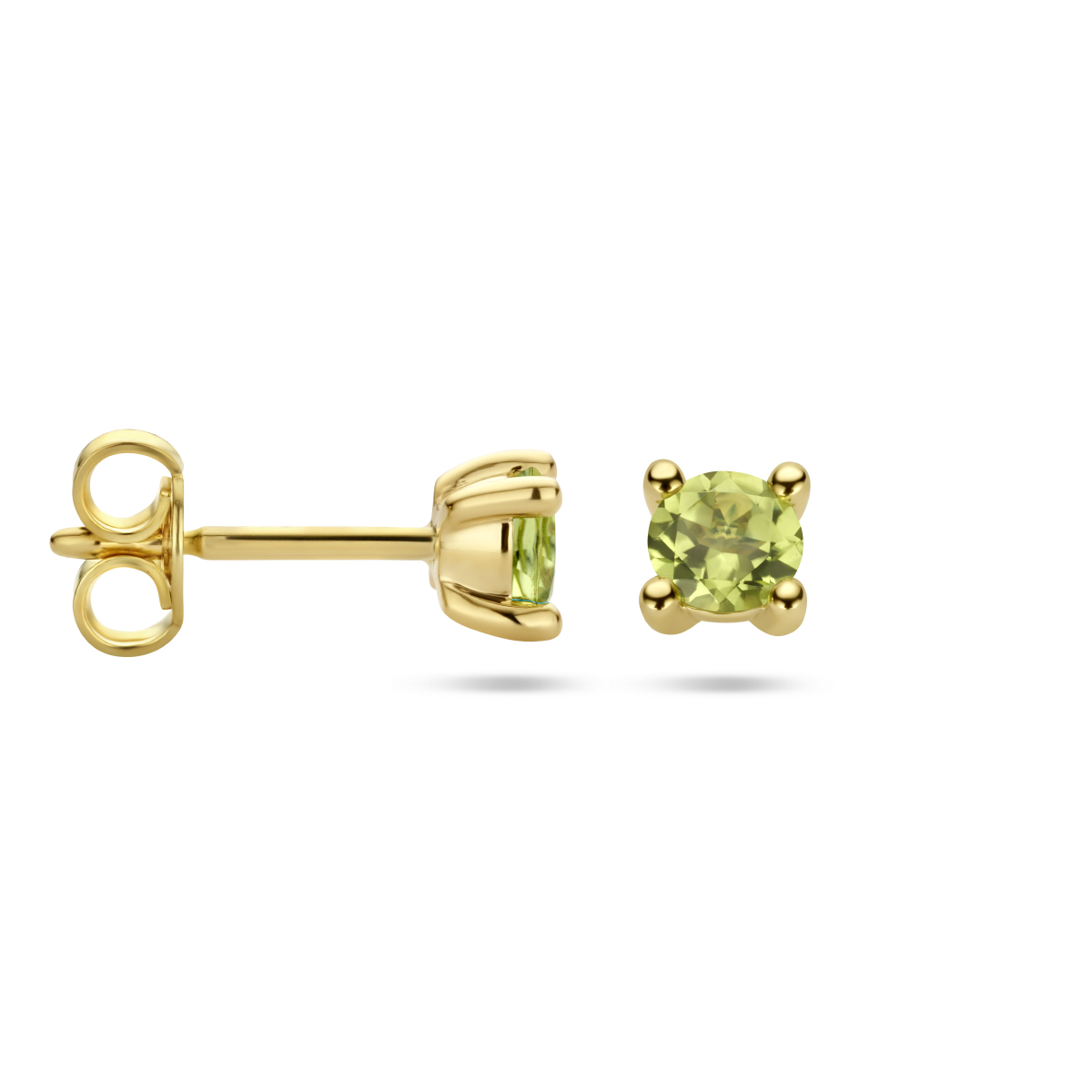 Prachtige groene peridot, briljant geslepen en gezet in een 14k geelgouden vierpoot chaton zetting. De stenen hebben een diameter van 4mm. Ze zijn daardoor niet te groot maar vallen door de groene kleur goed op.