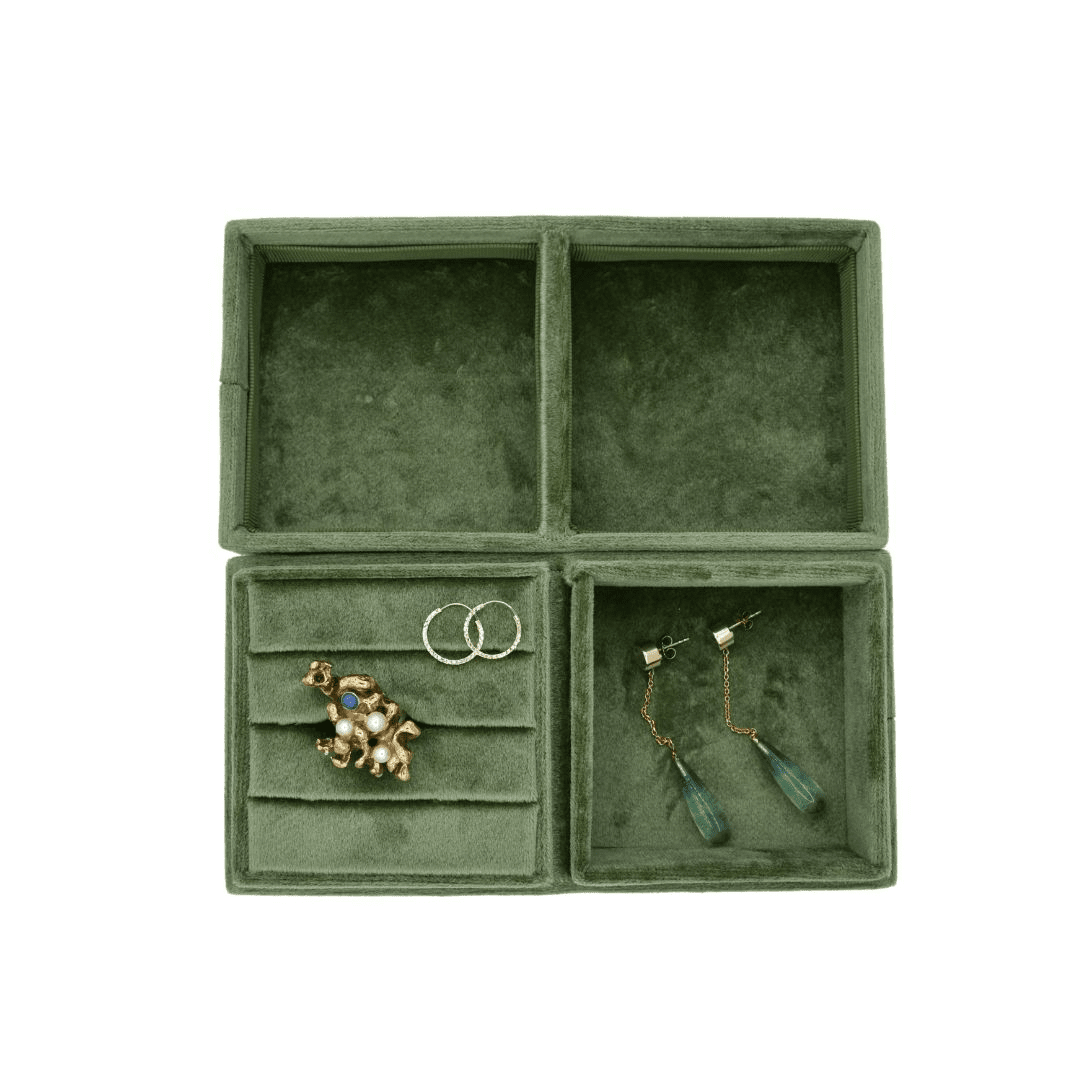 De velours sieraden doosjes van De Ekster zijn super chique en handig. Deze grotere variant staat mooi op je nachtkastje of kaptafel en heeft twee verschillende opbergmogelijkheden. Één vak kan worden gebruikt om ringen en oorbellen in op te bergen, het andere vak is een open vak waar bijvoorbeeld kettingen en armbanden in kunnen worden opgeborgen. Zo blijven al je sieraden mooi. De sieraden op de foto zijn allemaal met de hand gemaakt en ontworpen door De Ekster Handmade Jewelry, gevestigd te Amsterdam.