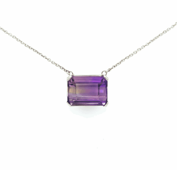 Met dit 14k witgouden collier en een indrukwekkende ametrien maak je gegarandeerd een statement. De royale edelsteen van 15,5 x 12 mm combineert de diepte van amethist met de warme gloed van citrien, wat zorgt voor een uniek kleurenspel en een luxe uitstraling.