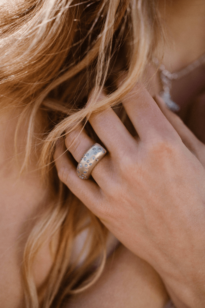Van opzij heeft de ring de elegante vorm van een schelp, terwijl de bovenkant subtiel is afgewerkt met zachte golfjes – een ontwerp dat duidelijk geïnspireerd is door de oceaan.